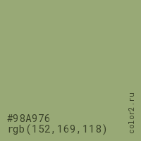 Цвет #98A976 в цветовой модели RGB обозначается тремя октетами (152, 169, 118) в десятичном формате и #98A976 в шестнадцатиричном (hex) формате, которые являются интенсивностью красного 152 (hex 98), интенсивность зелёного 169 (hex A9) и интенсивность синего 118 (hex 76).