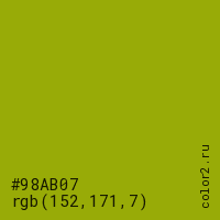 Цвет #98AB07 в цветовой модели RGB обозначается тремя октетами (152, 171, 7) в десятичном формате и #98AB07 в шестнадцатиричном (hex) формате, которые являются интенсивностью красного 152 (hex 98), интенсивность зелёного 171 (hex AB) и интенсивность синего 7 (hex 07).