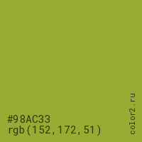 Цвет #98AC33 в цветовой модели RGB обозначается тремя октетами (152, 172, 51) в десятичном формате и #98AC33 в шестнадцатиричном (hex) формате, которые являются интенсивностью красного 152 (hex 98), интенсивность зелёного 172 (hex AC) и интенсивность синего 51 (hex 33).