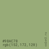 Цвет #98AC78 в цветовой модели RGB обозначается тремя октетами (152, 172, 120) в десятичном формате и #98AC78 в шестнадцатиричном (hex) формате, которые являются интенсивностью красного 152 (hex 98), интенсивность зелёного 172 (hex AC) и интенсивность синего 120 (hex 78).