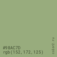 Цвет #98AC7D в цветовой модели RGB обозначается тремя октетами (152, 172, 125) в десятичном формате и #98AC7D в шестнадцатиричном (hex) формате, которые являются интенсивностью красного 152 (hex 98), интенсивность зелёного 172 (hex AC) и интенсивность синего 125 (hex 7D).