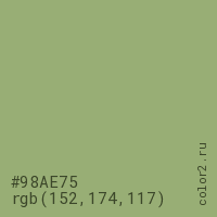 Цвет #98AE75 в цветовой модели RGB обозначается тремя октетами (152, 174, 117) в десятичном формате и #98AE75 в шестнадцатиричном (hex) формате, которые являются интенсивностью красного 152 (hex 98), интенсивность зелёного 174 (hex AE) и интенсивность синего 117 (hex 75).