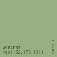 Цвет #98AF83 в цветовой модели RGB обозначается тремя октетами (152, 175, 131) в десятичном формате и #98AF83 в шестнадцатиричном (hex) формате, которые являются интенсивностью красного 152 (hex 98), интенсивность зелёного 175 (hex AF) и интенсивность синего 131 (hex 83).
