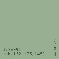 Цвет #98AF91 в цветовой модели RGB обозначается тремя октетами (152, 175, 145) в десятичном формате и #98AF91 в шестнадцатиричном (hex) формате, которые являются интенсивностью красного 152 (hex 98), интенсивность зелёного 175 (hex AF) и интенсивность синего 145 (hex 91).