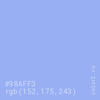 Цвет #98AFF3 в цветовой модели RGB обозначается тремя октетами (152, 175, 243) в десятичном формате и #98AFF3 в шестнадцатиричном (hex) формате, которые являются интенсивностью красного 152 (hex 98), интенсивность зелёного 175 (hex AF) и интенсивность синего 243 (hex F3).