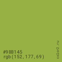 Цвет #98B145 в цветовой модели RGB обозначается тремя октетами (152, 177, 69) в десятичном формате и #98B145 в шестнадцатиричном (hex) формате, которые являются интенсивностью красного 152 (hex 98), интенсивность зелёного 177 (hex B1) и интенсивность синего 69 (hex 45).