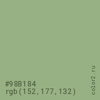 Цвет #98B184 в цветовой модели RGB обозначается тремя октетами (152, 177, 132) в десятичном формате и #98B184 в шестнадцатиричном (hex) формате, которые являются интенсивностью красного 152 (hex 98), интенсивность зелёного 177 (hex B1) и интенсивность синего 132 (hex 84).