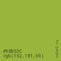 Цвет #98B53C в цветовой модели RGB обозначается тремя октетами (152, 181, 60) в десятичном формате и #98B53C в шестнадцатиричном (hex) формате, которые являются интенсивностью красного 152 (hex 98), интенсивность зелёного 181 (hex B5) и интенсивность синего 60 (hex 3C).