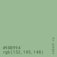 Цвет #98B994 в цветовой модели RGB обозначается тремя октетами (152, 185, 148) в десятичном формате и #98B994 в шестнадцатиричном (hex) формате, которые являются интенсивностью красного 152 (hex 98), интенсивность зелёного 185 (hex B9) и интенсивность синего 148 (hex 94).