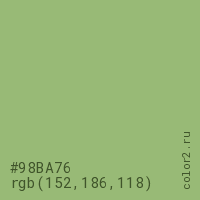 Цвет #98BA76 в цветовой модели RGB обозначается тремя октетами (152, 186, 118) в десятичном формате и #98BA76 в шестнадцатиричном (hex) формате, которые являются интенсивностью красного 152 (hex 98), интенсивность зелёного 186 (hex BA) и интенсивность синего 118 (hex 76).