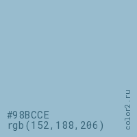 Цвет #98BCCE в цветовой модели RGB обозначается тремя октетами (152, 188, 206) в десятичном формате и #98BCCE в шестнадцатиричном (hex) формате, которые являются интенсивностью красного 152 (hex 98), интенсивность зелёного 188 (hex BC) и интенсивность синего 206 (hex CE).