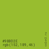 Цвет #98BD2E в цветовой модели RGB обозначается тремя октетами (152, 189, 46) в десятичном формате и #98BD2E в шестнадцатиричном (hex) формате, которые являются интенсивностью красного 152 (hex 98), интенсивность зелёного 189 (hex BD) и интенсивность синего 46 (hex 2E).
