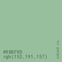 Цвет #98BF9D в цветовой модели RGB обозначается тремя октетами (152, 191, 157) в десятичном формате и #98BF9D в шестнадцатиричном (hex) формате, которые являются интенсивностью красного 152 (hex 98), интенсивность зелёного 191 (hex BF) и интенсивность синего 157 (hex 9D).