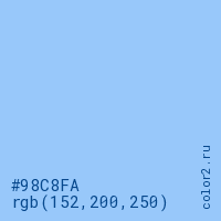Цвет #98C8FA в цветовой модели RGB обозначается тремя октетами (152, 200, 250) в десятичном формате и #98C8FA в шестнадцатиричном (hex) формате, которые являются интенсивностью красного 152 (hex 98), интенсивность зелёного 200 (hex C8) и интенсивность синего 250 (hex FA).