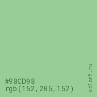 Цвет #98CD98 в цветовой модели RGB обозначается тремя октетами (152, 205, 152) в десятичном формате и #98CD98 в шестнадцатиричном (hex) формате, которые являются интенсивностью красного 152 (hex 98), интенсивность зелёного 205 (hex CD) и интенсивность синего 152 (hex 98).