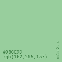 Цвет #98CE9D в цветовой модели RGB обозначается тремя октетами (152, 206, 157) в десятичном формате и #98CE9D в шестнадцатиричном (hex) формате, которые являются интенсивностью красного 152 (hex 98), интенсивность зелёного 206 (hex CE) и интенсивность синего 157 (hex 9D).