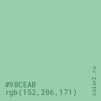 Цвет #98CEAB в цветовой модели RGB обозначается тремя октетами (152, 206, 171) в десятичном формате и #98CEAB в шестнадцатиричном (hex) формате, которые являются интенсивностью красного 152 (hex 98), интенсивность зелёного 206 (hex CE) и интенсивность синего 171 (hex AB).