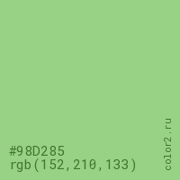 Цвет #98D285 в цветовой модели RGB обозначается тремя октетами (152, 210, 133) в десятичном формате и #98D285 в шестнадцатиричном (hex) формате, которые являются интенсивностью красного 152 (hex 98), интенсивность зелёного 210 (hex D2) и интенсивность синего 133 (hex 85).