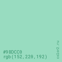Цвет #98DCC0 в цветовой модели RGB обозначается тремя октетами (152, 220, 192) в десятичном формате и #98DCC0 в шестнадцатиричном (hex) формате, которые являются интенсивностью красного 152 (hex 98), интенсивность зелёного 220 (hex DC) и интенсивность синего 192 (hex C0).