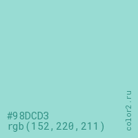 Цвет #98DCD3 в цветовой модели RGB обозначается тремя октетами (152, 220, 211) в десятичном формате и #98DCD3 в шестнадцатиричном (hex) формате, которые являются интенсивностью красного 152 (hex 98), интенсивность зелёного 220 (hex DC) и интенсивность синего 211 (hex D3).