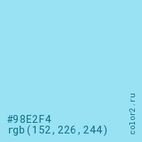 Цвет #98E2F4 в цветовой модели RGB обозначается тремя октетами (152, 226, 244) в десятичном формате и #98E2F4 в шестнадцатиричном (hex) формате, которые являются интенсивностью красного 152 (hex 98), интенсивность зелёного 226 (hex E2) и интенсивность синего 244 (hex F4).