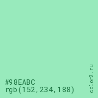 Цвет #98EABC в цветовой модели RGB обозначается тремя октетами (152, 234, 188) в десятичном формате и #98EABC в шестнадцатиричном (hex) формате, которые являются интенсивностью красного 152 (hex 98), интенсивность зелёного 234 (hex EA) и интенсивность синего 188 (hex BC).