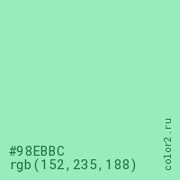 Цвет #98EBBC в цветовой модели RGB обозначается тремя октетами (152, 235, 188) в десятичном формате и #98EBBC в шестнадцатиричном (hex) формате, которые являются интенсивностью красного 152 (hex 98), интенсивность зелёного 235 (hex EB) и интенсивность синего 188 (hex BC).