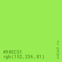 Цвет #98EC51 в цветовой модели RGB обозначается тремя октетами (152, 236, 81) в десятичном формате и #98EC51 в шестнадцатиричном (hex) формате, которые являются интенсивностью красного 152 (hex 98), интенсивность зелёного 236 (hex EC) и интенсивность синего 81 (hex 51).