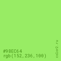 Цвет #98EC64 в цветовой модели RGB обозначается тремя октетами (152, 236, 100) в десятичном формате и #98EC64 в шестнадцатиричном (hex) формате, которые являются интенсивностью красного 152 (hex 98), интенсивность зелёного 236 (hex EC) и интенсивность синего 100 (hex 64).