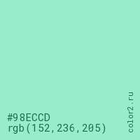 Цвет #98ECCD в цветовой модели RGB обозначается тремя октетами (152, 236, 205) в десятичном формате и #98ECCD в шестнадцатиричном (hex) формате, которые являются интенсивностью красного 152 (hex 98), интенсивность зелёного 236 (hex EC) и интенсивность синего 205 (hex CD).