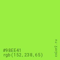 Цвет #98EE41 в цветовой модели RGB обозначается тремя октетами (152, 238, 65) в десятичном формате и #98EE41 в шестнадцатиричном (hex) формате, которые являются интенсивностью красного 152 (hex 98), интенсивность зелёного 238 (hex EE) и интенсивность синего 65 (hex 41).