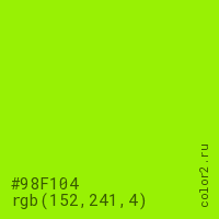 Цвет #98F104 в цветовой модели RGB обозначается тремя октетами (152, 241, 4) в десятичном формате и #98F104 в шестнадцатиричном (hex) формате, которые являются интенсивностью красного 152 (hex 98), интенсивность зелёного 241 (hex F1) и интенсивность синего 4 (hex 04).