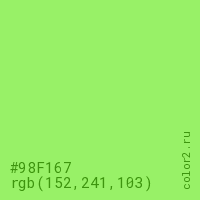 Цвет #98F167 в цветовой модели RGB обозначается тремя октетами (152, 241, 103) в десятичном формате и #98F167 в шестнадцатиричном (hex) формате, которые являются интенсивностью красного 152 (hex 98), интенсивность зелёного 241 (hex F1) и интенсивность синего 103 (hex 67).