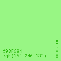 Цвет #98F684 в цветовой модели RGB обозначается тремя октетами (152, 246, 132) в десятичном формате и #98F684 в шестнадцатиричном (hex) формате, которые являются интенсивностью красного 152 (hex 98), интенсивность зелёного 246 (hex F6) и интенсивность синего 132 (hex 84).