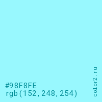 Цвет #98F8FE в цветовой модели RGB обозначается тремя октетами (152, 248, 254) в десятичном формате и #98F8FE в шестнадцатиричном (hex) формате, которые являются интенсивностью красного 152 (hex 98), интенсивность зелёного 248 (hex F8) и интенсивность синего 254 (hex FE).