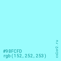 Цвет #98FCFD в цветовой модели RGB обозначается тремя октетами (152, 252, 253) в десятичном формате и #98FCFD в шестнадцатиричном (hex) формате, которые являются интенсивностью красного 152 (hex 98), интенсивность зелёного 252 (hex FC) и интенсивность синего 253 (hex FD).