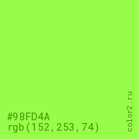Цвет #98FD4A в цветовой модели RGB обозначается тремя октетами (152, 253, 74) в десятичном формате и #98FD4A в шестнадцатиричном (hex) формате, которые являются интенсивностью красного 152 (hex 98), интенсивность зелёного 253 (hex FD) и интенсивность синего 74 (hex 4A).