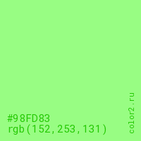 Цвет #98FD83 в цветовой модели RGB обозначается тремя октетами (152, 253, 131) в десятичном формате и #98FD83 в шестнадцатиричном (hex) формате, которые являются интенсивностью красного 152 (hex 98), интенсивность зелёного 253 (hex FD) и интенсивность синего 131 (hex 83).