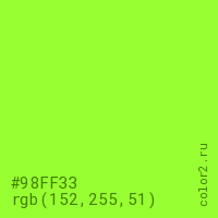 Цвет #98FF33 в цветовой модели RGB обозначается тремя октетами (152, 255, 51) в десятичном формате и #98FF33 в шестнадцатиричном (hex) формате, которые являются интенсивностью красного 152 (hex 98), интенсивность зелёного 255 (hex FF) и интенсивность синего 51 (hex 33).