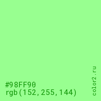 Цвет #98FF90 в цветовой модели RGB обозначается тремя октетами (152, 255, 144) в десятичном формате и #98FF90 в шестнадцатиричном (hex) формате, которые являются интенсивностью красного 152 (hex 98), интенсивность зелёного 255 (hex FF) и интенсивность синего 144 (hex 90).