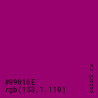 Цвет #99016E в цветовой модели RGB обозначается тремя октетами (153, 1, 110) в десятичном формате и #99016E в шестнадцатиричном (hex) формате, которые являются интенсивностью красного 153 (hex 99), интенсивность зелёного 1 (hex 01) и интенсивность синего 110 (hex 6E).