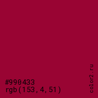 Цвет #990433 в цветовой модели RGB обозначается тремя октетами (153, 4, 51) в десятичном формате и #990433 в шестнадцатиричном (hex) формате, которые являются интенсивностью красного 153 (hex 99), интенсивность зелёного 4 (hex 04) и интенсивность синего 51 (hex 33).