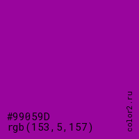 Цвет #99059D в цветовой модели RGB обозначается тремя октетами (153, 5, 157) в десятичном формате и #99059D в шестнадцатиричном (hex) формате, которые являются интенсивностью красного 153 (hex 99), интенсивность зелёного 5 (hex 05) и интенсивность синего 157 (hex 9D).