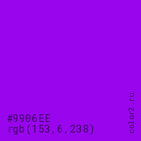 Цвет #9906EE в цветовой модели RGB обозначается тремя октетами (153, 6, 238) в десятичном формате и #9906EE в шестнадцатиричном (hex) формате, которые являются интенсивностью красного 153 (hex 99), интенсивность зелёного 6 (hex 06) и интенсивность синего 238 (hex EE).