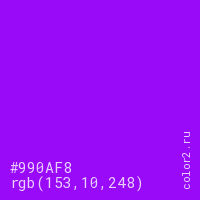 Цвет #990AF8 в цветовой модели RGB обозначается тремя октетами (153, 10, 248) в десятичном формате и #990AF8 в шестнадцатиричном (hex) формате, которые являются интенсивностью красного 153 (hex 99), интенсивность зелёного 10 (hex 0A) и интенсивность синего 248 (hex F8).
