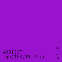 Цвет #9913CF в цветовой модели RGB обозначается тремя октетами (153, 19, 207) в десятичном формате и #9913CF в шестнадцатиричном (hex) формате, которые являются интенсивностью красного 153 (hex 99), интенсивность зелёного 19 (hex 13) и интенсивность синего 207 (hex CF).