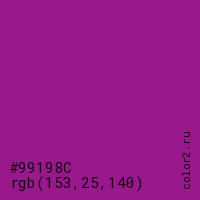 Цвет #99198C в цветовой модели RGB обозначается тремя октетами (153, 25, 140) в десятичном формате и #99198C в шестнадцатиричном (hex) формате, которые являются интенсивностью красного 153 (hex 99), интенсивность зелёного 25 (hex 19) и интенсивность синего 140 (hex 8C).