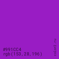 Цвет #991CC4 в цветовой модели RGB обозначается тремя октетами (153, 28, 196) в десятичном формате и #991CC4 в шестнадцатиричном (hex) формате, которые являются интенсивностью красного 153 (hex 99), интенсивность зелёного 28 (hex 1C) и интенсивность синего 196 (hex C4).