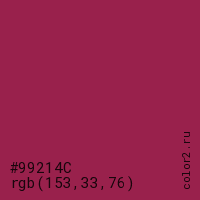 Цвет #99214C в цветовой модели RGB обозначается тремя октетами (153, 33, 76) в десятичном формате и #99214C в шестнадцатиричном (hex) формате, которые являются интенсивностью красного 153 (hex 99), интенсивность зелёного 33 (hex 21) и интенсивность синего 76 (hex 4C).
