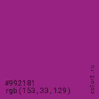 Цвет #992181 в цветовой модели RGB обозначается тремя октетами (153, 33, 129) в десятичном формате и #992181 в шестнадцатиричном (hex) формате, которые являются интенсивностью красного 153 (hex 99), интенсивность зелёного 33 (hex 21) и интенсивность синего 129 (hex 81).